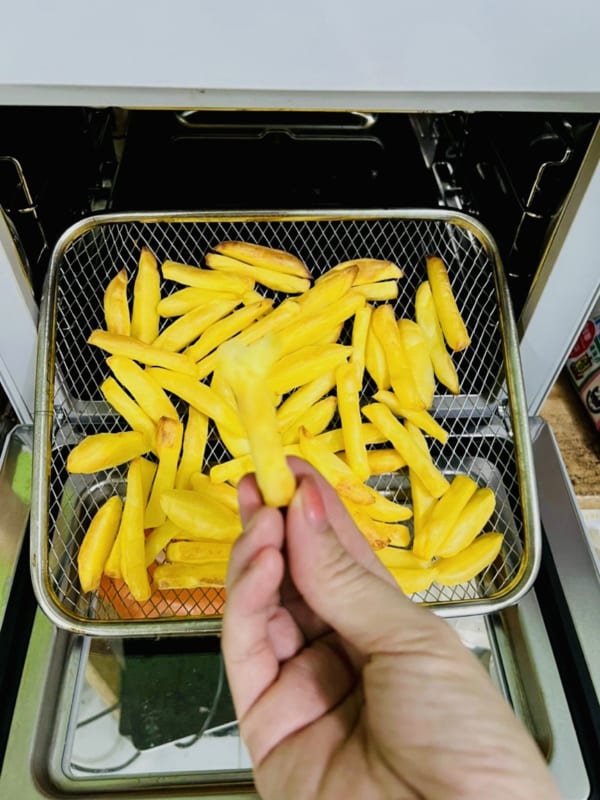 - Sấy táo bằng nồi chiên không dầu: Rửa sạch táo, bỏ hạt và cắt thành những lát mỏng và đều nhau. Sau đó, xếp táo lên giá của nồi chiên không dầu và sấy trong khoảng 2-3 giờ ở nhiệt độ 70-75 độ C.