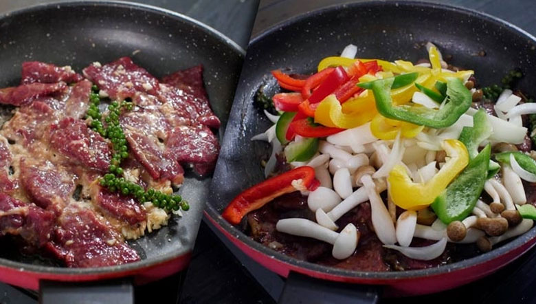 Bước 2: Làm nóng chảo với một ít dầu ăn, cho thịt bò và tiêu xanh vào chiên lửa lớn đến khi thịt hơi xém hai mặt. Cho ớt chuông, hành tây và nấm vào đảo đều, thêm hạt nêm vừa khẩu vị, xào cho các loại rau vừa chín tới.
