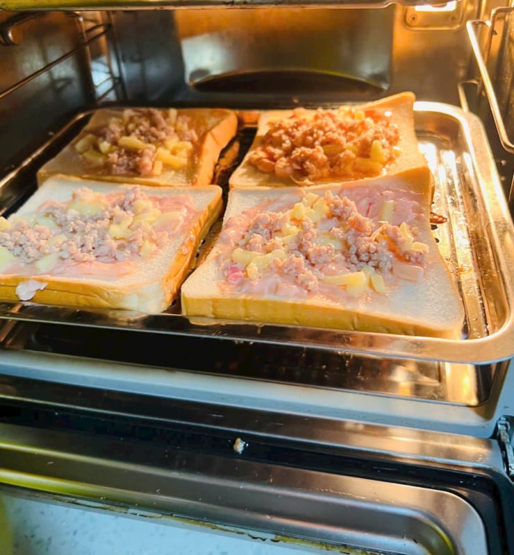 – Dàn đều hỗn hợp sốt lên mặt bánh sandwich, cho phô mai, rồi nhân xích xích/ thịt bằm, … (tuỳ thích) cho tiếp ớt chuông/ thơm/, …