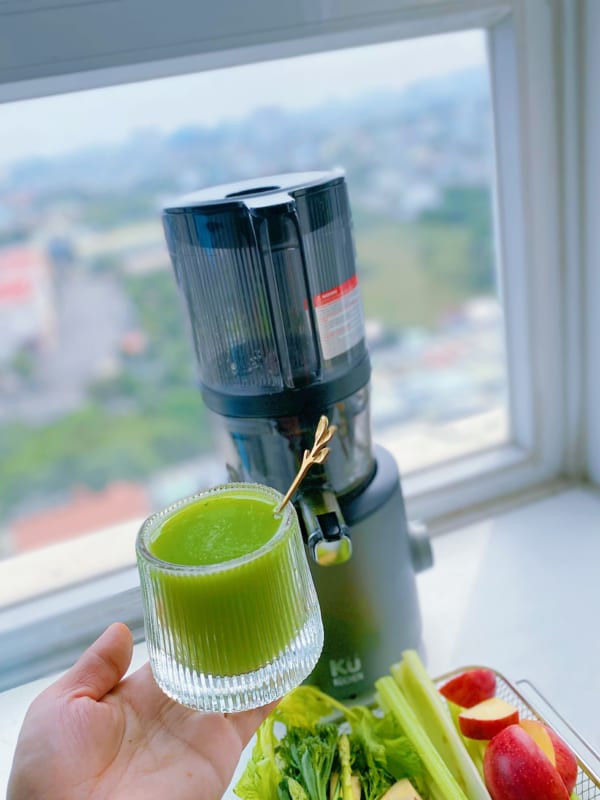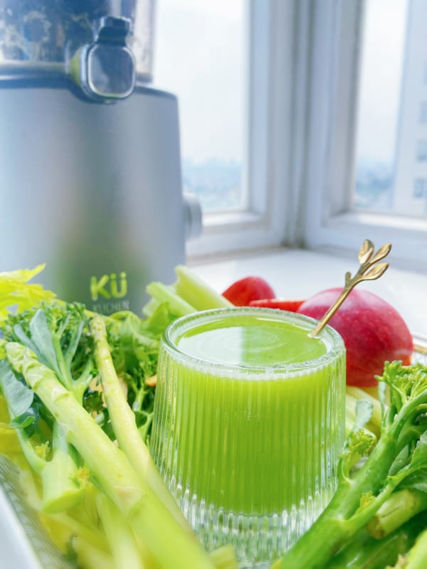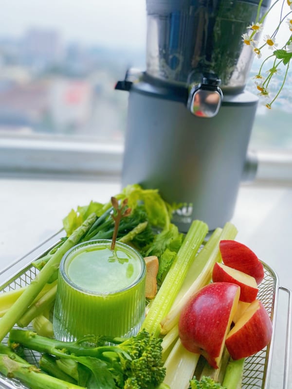 Và thành quả của máy ép chậm kuchen chúng ta là một ly nước ép măng tây kiểm hóa cơ thể màu xanh rất đẹp mắt.