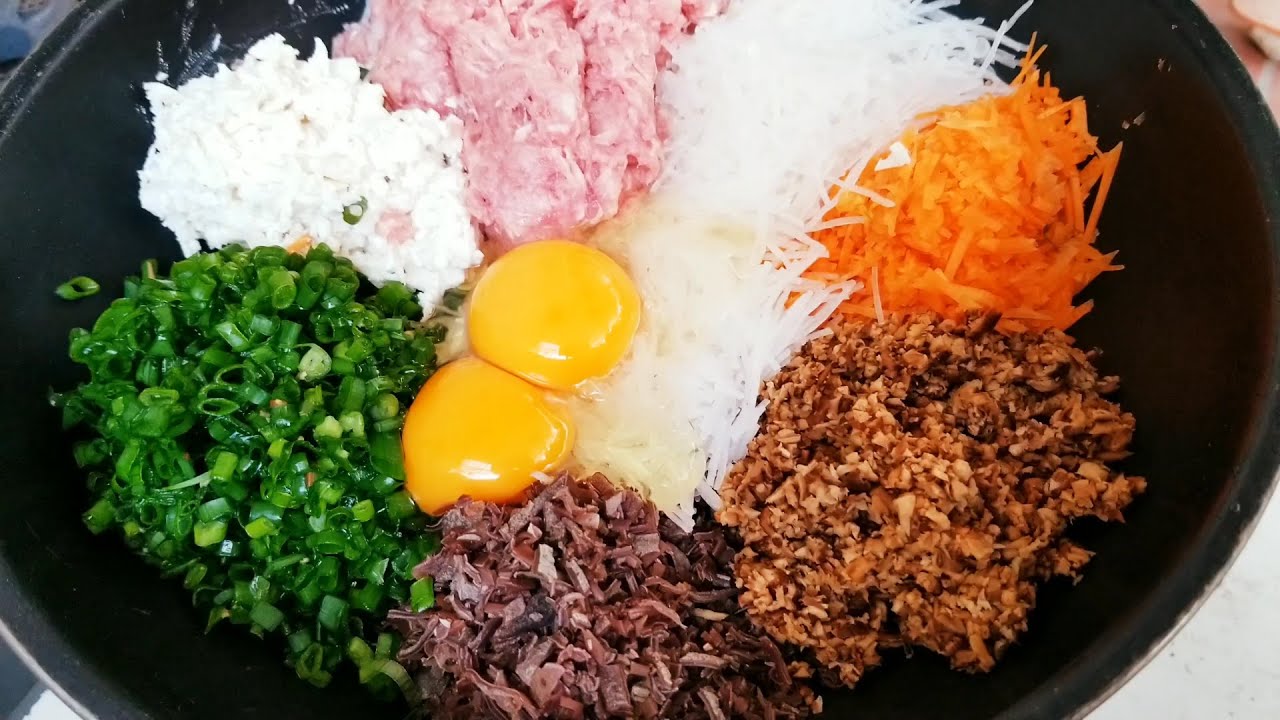 – Chuẩn bị một cái bát lớn, cho thịt, và các nguyên liệu đã sơ chế vào. Đập 3 quả trứng vào bát, thêm muối, mì chính, hạt tiêu và một chút nước mắm vào. Trộn đều các nguyên liệu với nhau. Lượng gia vị bạn tự nêm nếm sao cho hợp với khẩu vị gia đình
