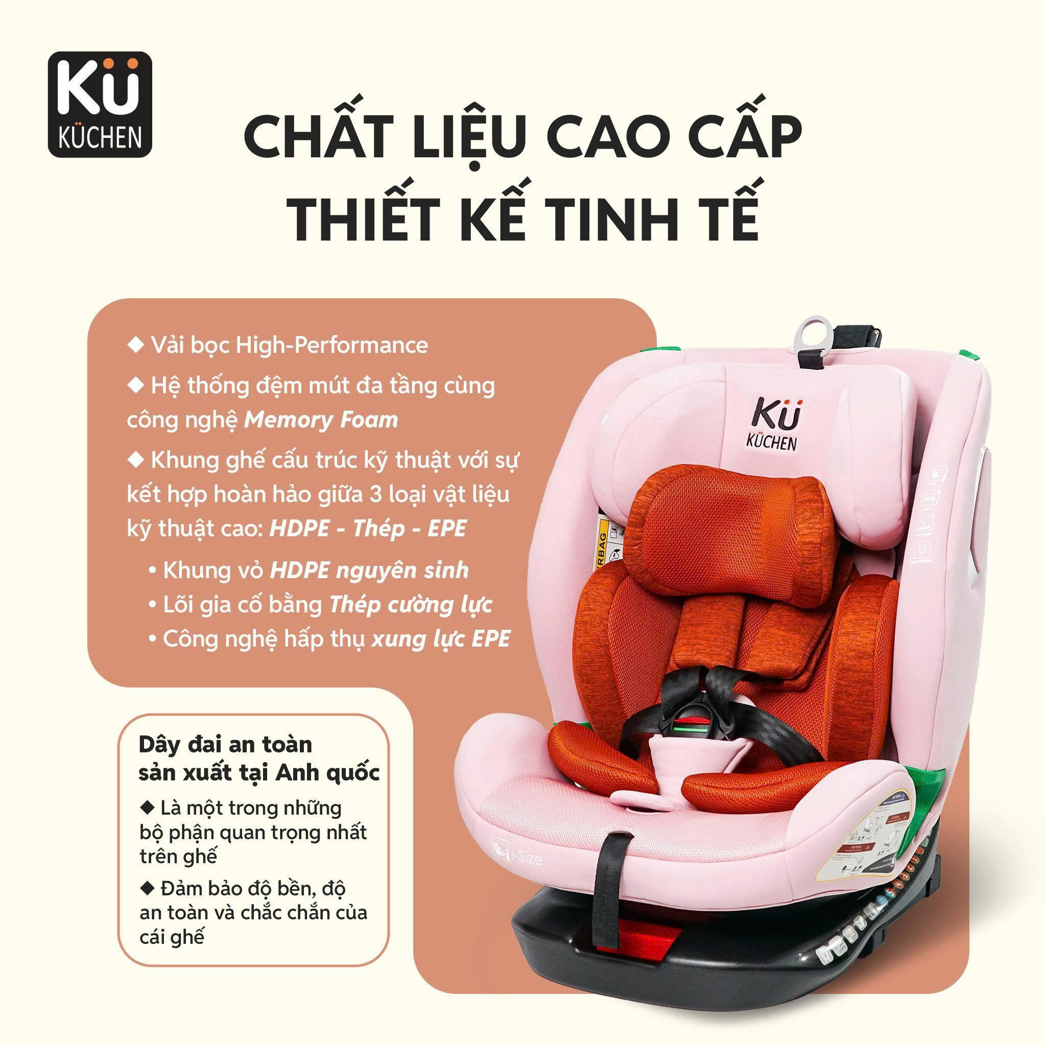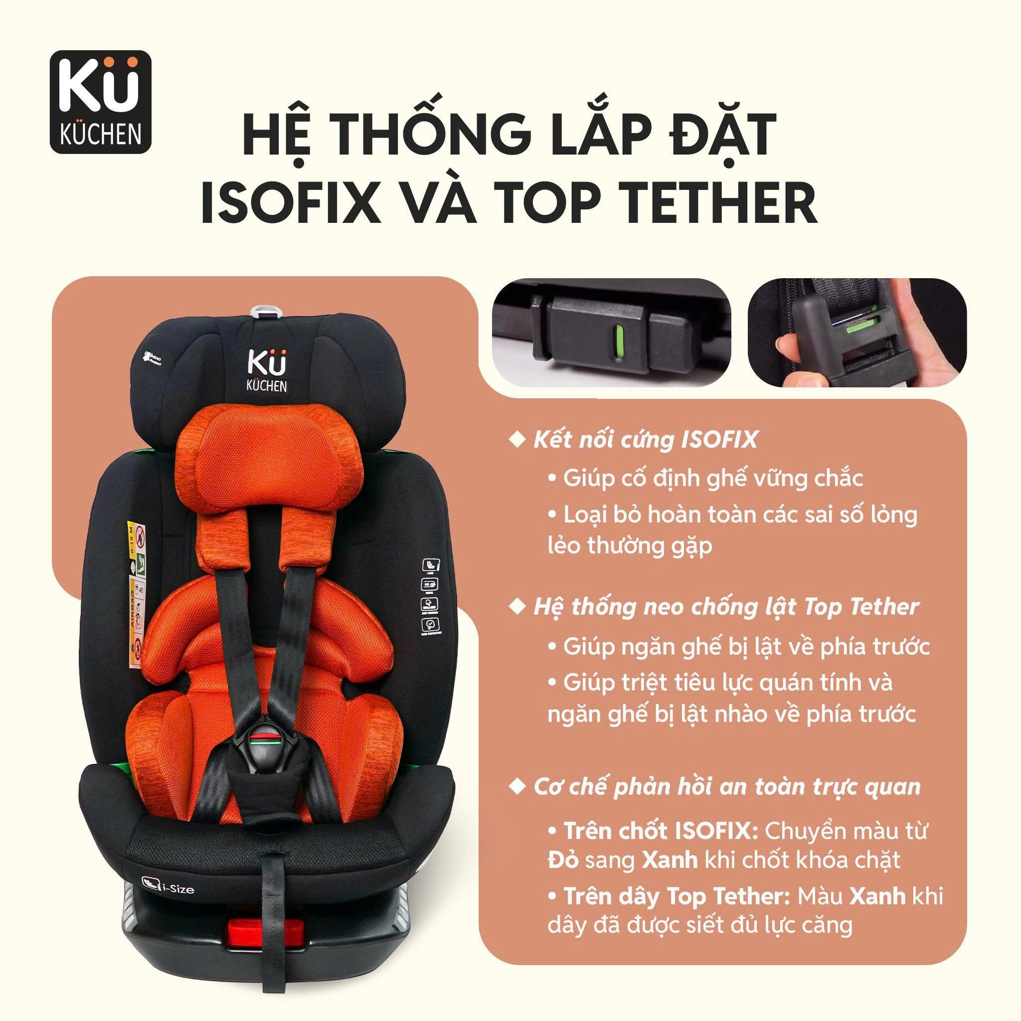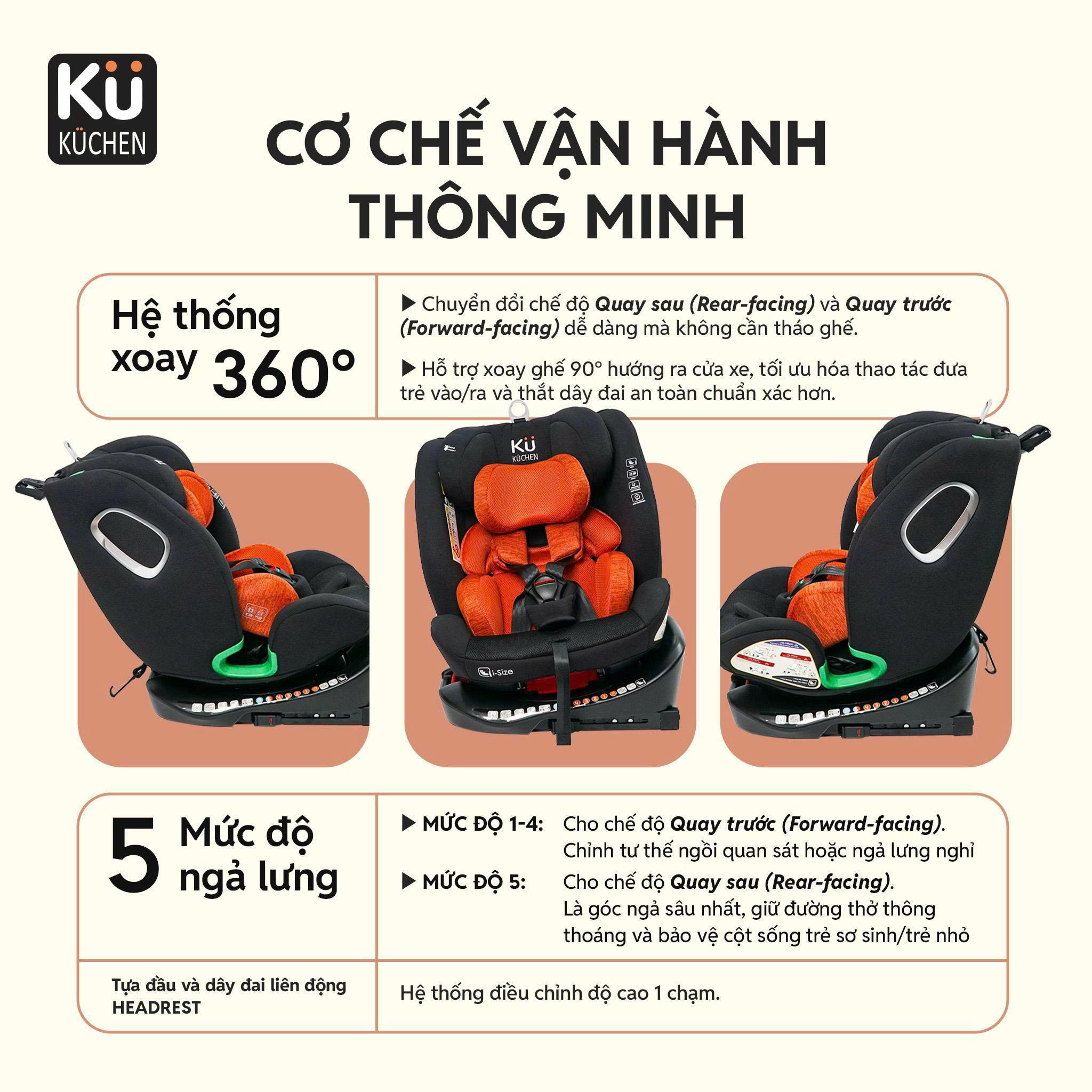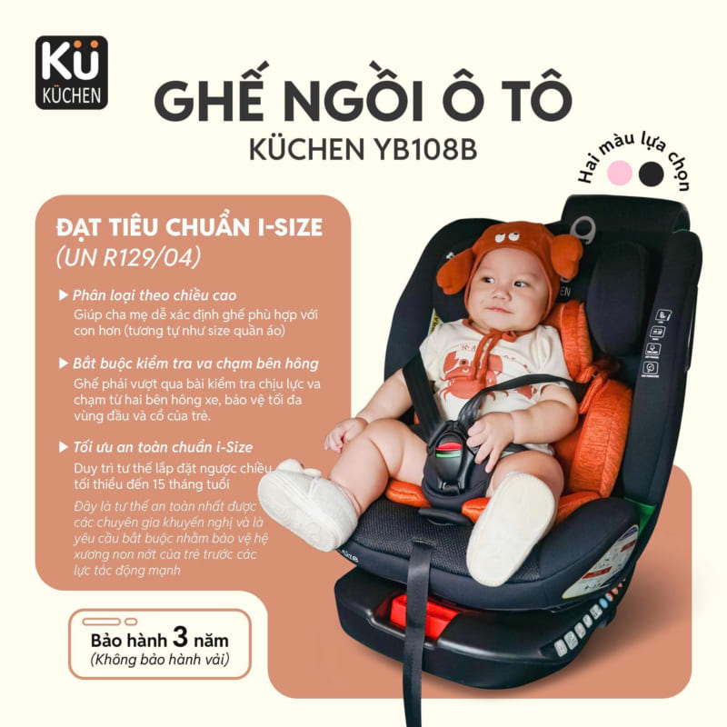 Ghế ngồi ô tô Kuchen YB108B là dòng ghế an toàn cao cấp đạt chuẩn i-Size UN R129/04, tích hợp hệ thống ISOFIX + Top Tether, xoay 360° tiện lợi, sử dụng cho trẻ từ sơ sinh (40cm) đến 150cm (~12 tuổi). Một lần đầu tư – an toàn suốt 12 năm đầu đời của bé.