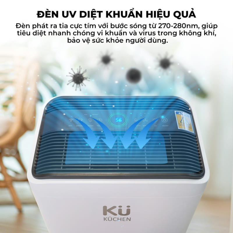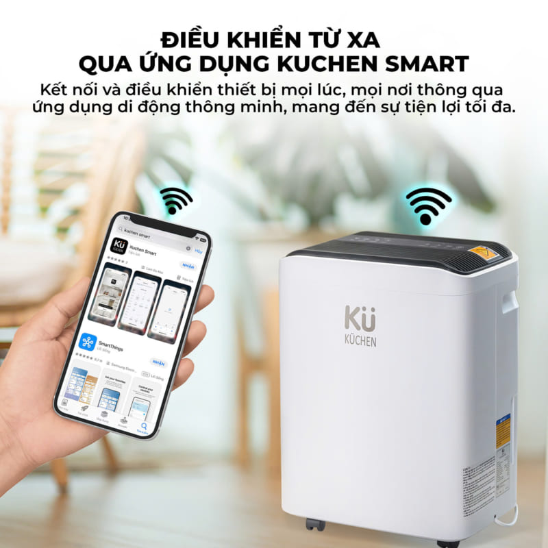 Tiện Lợi Mọi Lúc, Mọi Nơi: Thiết bị có khả năng kết nối với ứng dụng di động KUCHEN SMART, cho phép bạn dễ dàng điều khiển từ xa mọi lúc, mọi nơi. Bạn có thể theo dõi mức độ ẩm, bật/tắt thiết bị, hoặc điều chỉnh các cài đặt khác chỉ với vài cú chạm trên điện thoại. Tính năng này mang đến sự tiện lợi tối đa, giúp bạn quản lý và kiểm soát không khí trong nhà một cách hiệu quả ngay cả khi không có mặt tại nhà.