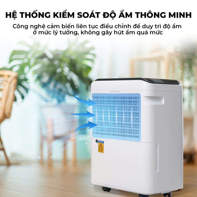 Điều Chỉnh Độ Ẩm Tự Động: Hệ thống sử dụng cảm biến độ ẩm hiện đại để theo dõi liên tục mức độ ẩm trong không khí. Thiết bị tự động điều chỉnh hoạt động của máy nén và quạt để duy trì độ ẩm ở mức lý tưởng, tránh tình trạng hút ẩm quá mức, có thể gây ảnh hưởng đến sức khỏe và các vật dụng trong nhà. Nếu độ ẩm giảm xuống dưới mức cài đặt 4%, hệ thống sẽ tự động tắt để tiết kiệm năng lượng. Quạt cũng sẽ ngừng hoạt động sau 5 phút khi máy nén dừng, giúp tối ưu hóa hiệu suất và kéo dài tuổi thọ của thiết bị.