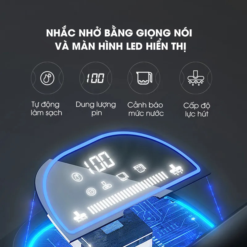Thông minh: Động cơ tự di chuyển. Chổi lăn có thể rẽ trái và phải, làm sạch gầm bàn, ghế, góc tường một cách dễ dàng. Nhắc nhở bằng màn hình, giọng nói