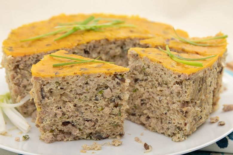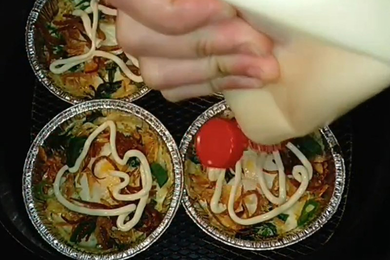 + Lật mặt sau của chả trứng, phết hỗn hợp (1) lên mặt chả. Tiếp tục chiên với nồi chiên không dầu ở 170 độ C trong 10 phút.